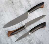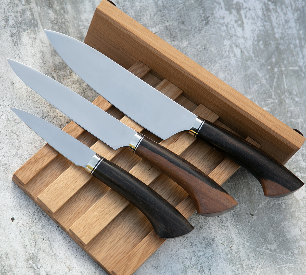 Набор Кухонных ножей из нержавеющей стали N690, рукоять - эбеновое дерево, кожаные чехлы и подставка под ножи идут в комплекте.